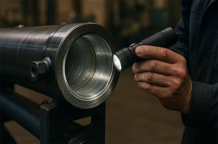 Coloque um dedo limpo no cilindro e toque na parede interna para verificar: qualquer arranhão mais profundo que 0,5 mm (sobre a espessura de uma unha) causará problemas persistentes de contaminação por fluidos. Ao mesmo tempo, observe se a parede interna do cilindro possui linhas uniformes de moagem finas. Se houver pontos ou ranhuras brilhantes, pode ser um sinal de dano do pistão. Antes de solicitar peças de reposição, você deve primeiro dominar o método de medir com precisão o cilindro hidráulico.